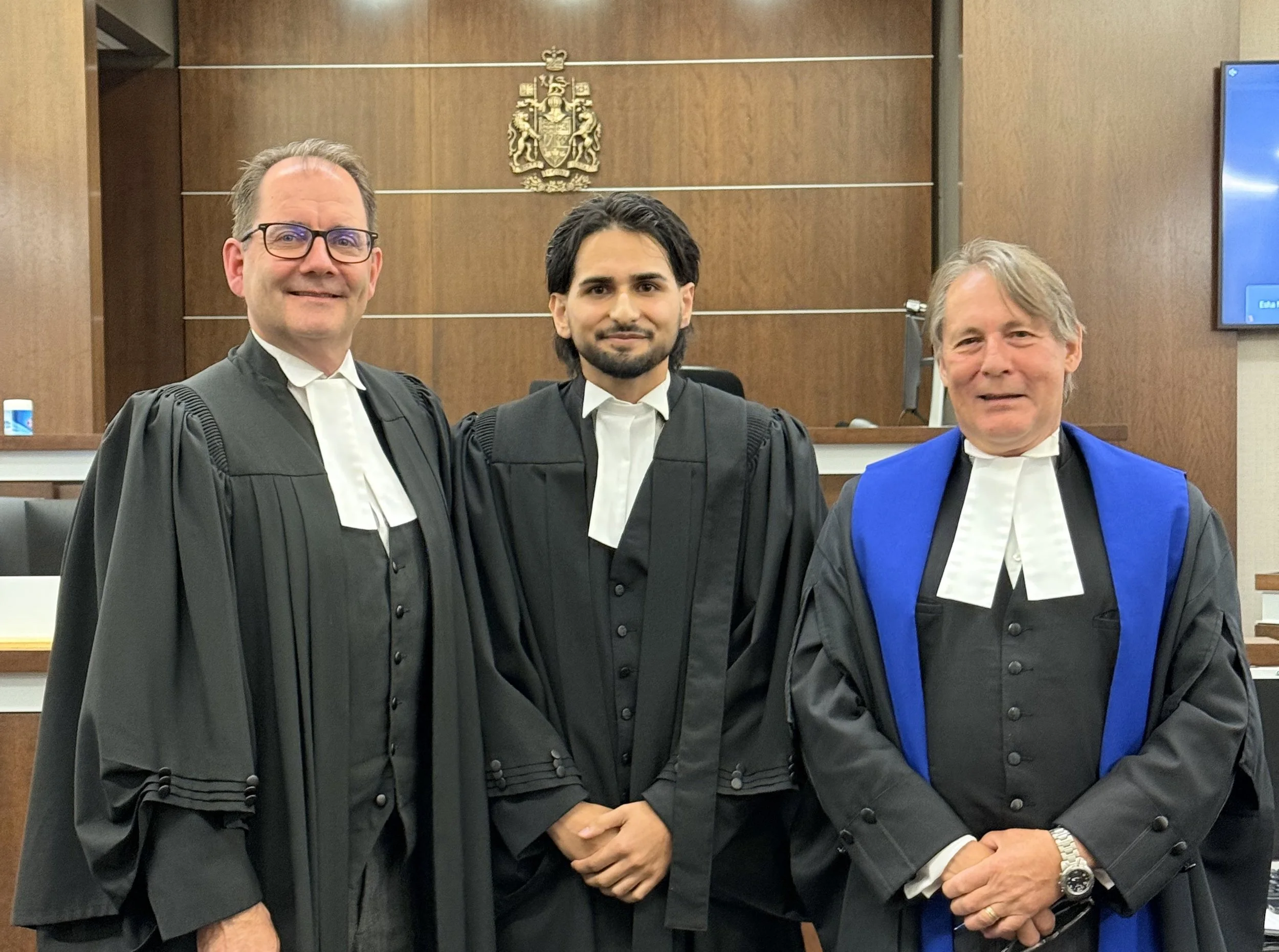 Shazaib Rashid at his bar call ceremony, with articling principal Eugene Bodnar (left) and Justice G.D.M. Stirling.